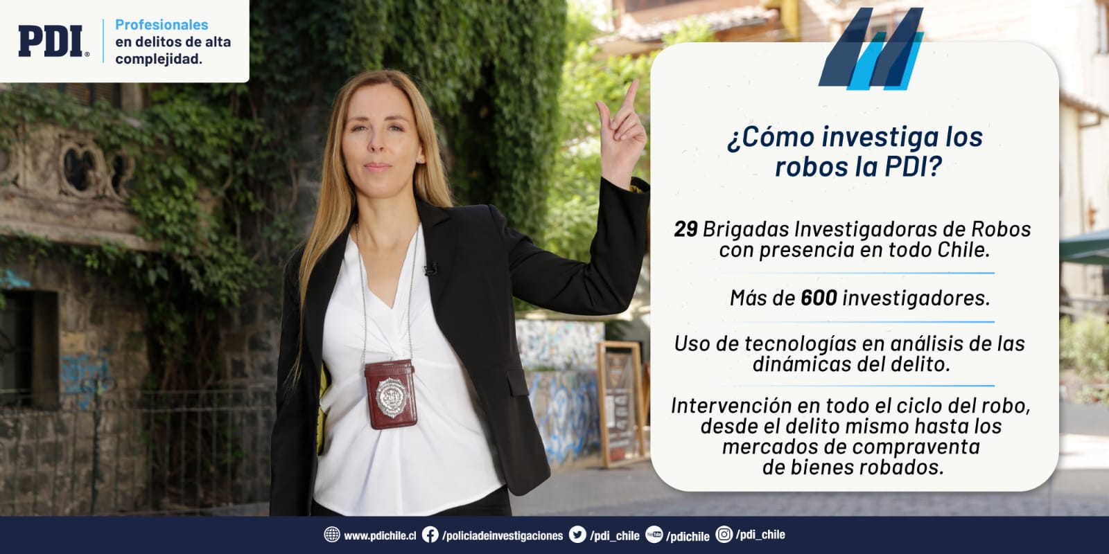 En la actualidad, a lo largo del territorio nacional, la PDI cuenta con 29 Brigadas Investigadoras de Robos, las que realizan investigaciones y análisis respecto de fenómenos delictuales en todo su ciclo, incluyendo la intervención de los mercados de bienes robados.