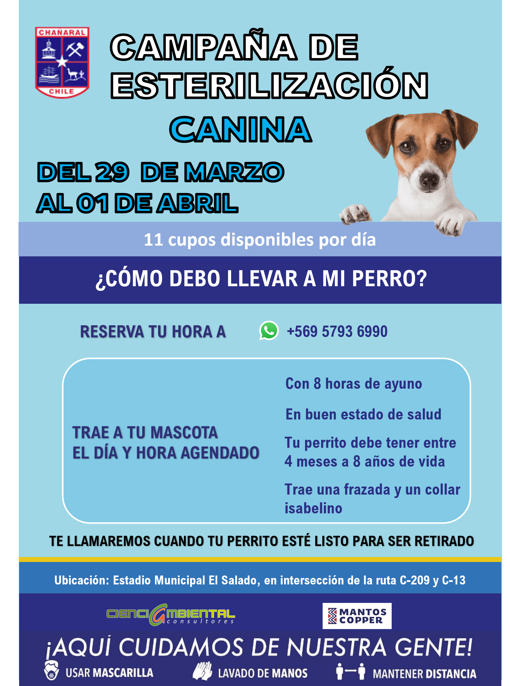 La comunidad de la localidad de El Salado será escenario de la campaña de esterilización canina, que se desarrollará desde el próximo 29 de marzo al 1 de abril, organizada por la Ilustre Municipalidad de Chañaral y Mantos Copper, y ejecutada por la Consultora Cienciambiental.