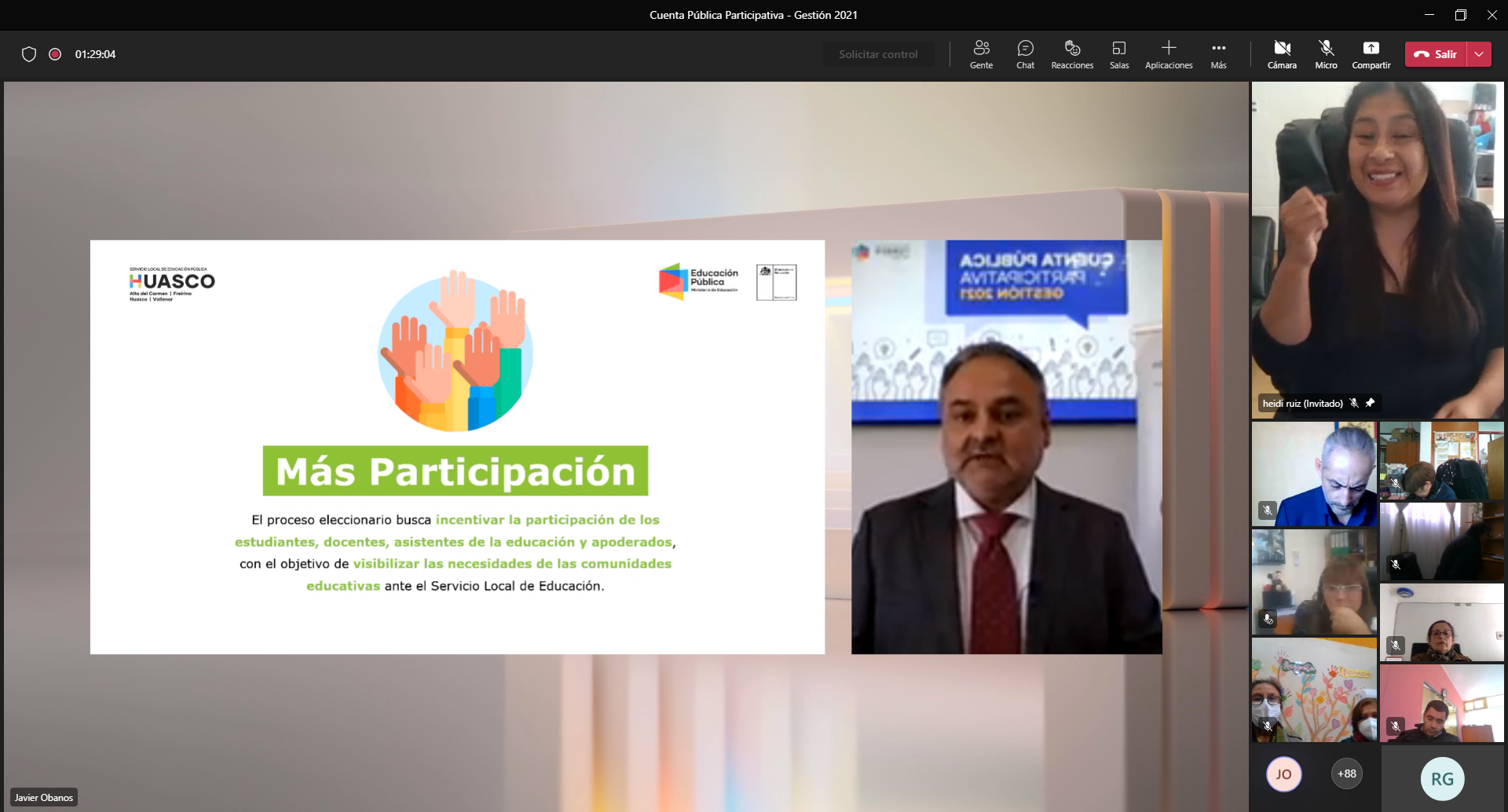 Con una gran participación de autoridades, directores, directoras, profesores y profesoras, asistentes de la educación y funcionarios, se llevó a cabo de manera remota, la presentación de la Cuenta Pública Participativa Gestión 2021 del Servicio Local de Educación Pública -SLEP- Huasco, liderada por el Director Ejecutivo, Javier Obanos Sandoval.