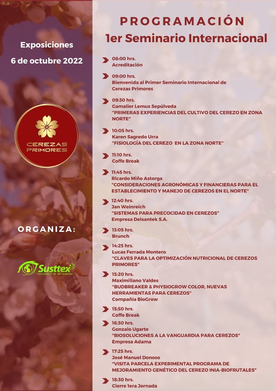 Personas expertas en diferentes áreas del cultivo y comercio de las cerezas se darán cita en el Primer Seminario de Cerezas Primores de Chile, este jueves 6 y viernes 7 de octubre en Ovalle y virtualmente a través de la transmisión streaming, siendo el punto de encuentro técnico-comercial de este rubro que está en rápido crecimiento en el norte del país y particularmente en los valles de Limarí.