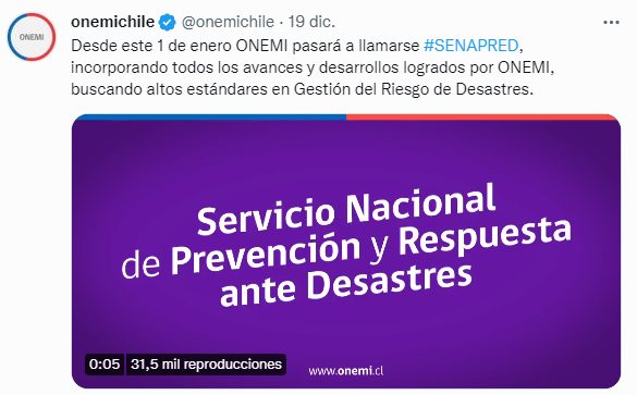 El martes 27 de julio de 2021, el Presidente de la República, Sebastián Piñera, promulgó la Ley que establece el Sistema Nacional de Prevención y Respuesta ante Desastres (SINAPRED). Este nuevo Sistema, y dentro de ello el Servicio Nacional de Prevención y Respuesta ante Desastres (SENAPRED), creados en la presente Ley, se basan fundamentalmente en reconocer e incorporar todos los avances y desarrollos que se han logrado en función de las buenas prácticas y lecciones aprendidas en estos últimos años en el actual Sistema Nacional de Protección Civil y en la ONEMI (a quienes reemplazan), avances los cuales, además, se busca actualizarlos, reforzarlos, estandarizarlos y hacerlos vinculantes para alcanzar estándares de excelencia en la Gestión del Riesgo de Desastres (GRD) centrados en la prevención y territorialidad.
