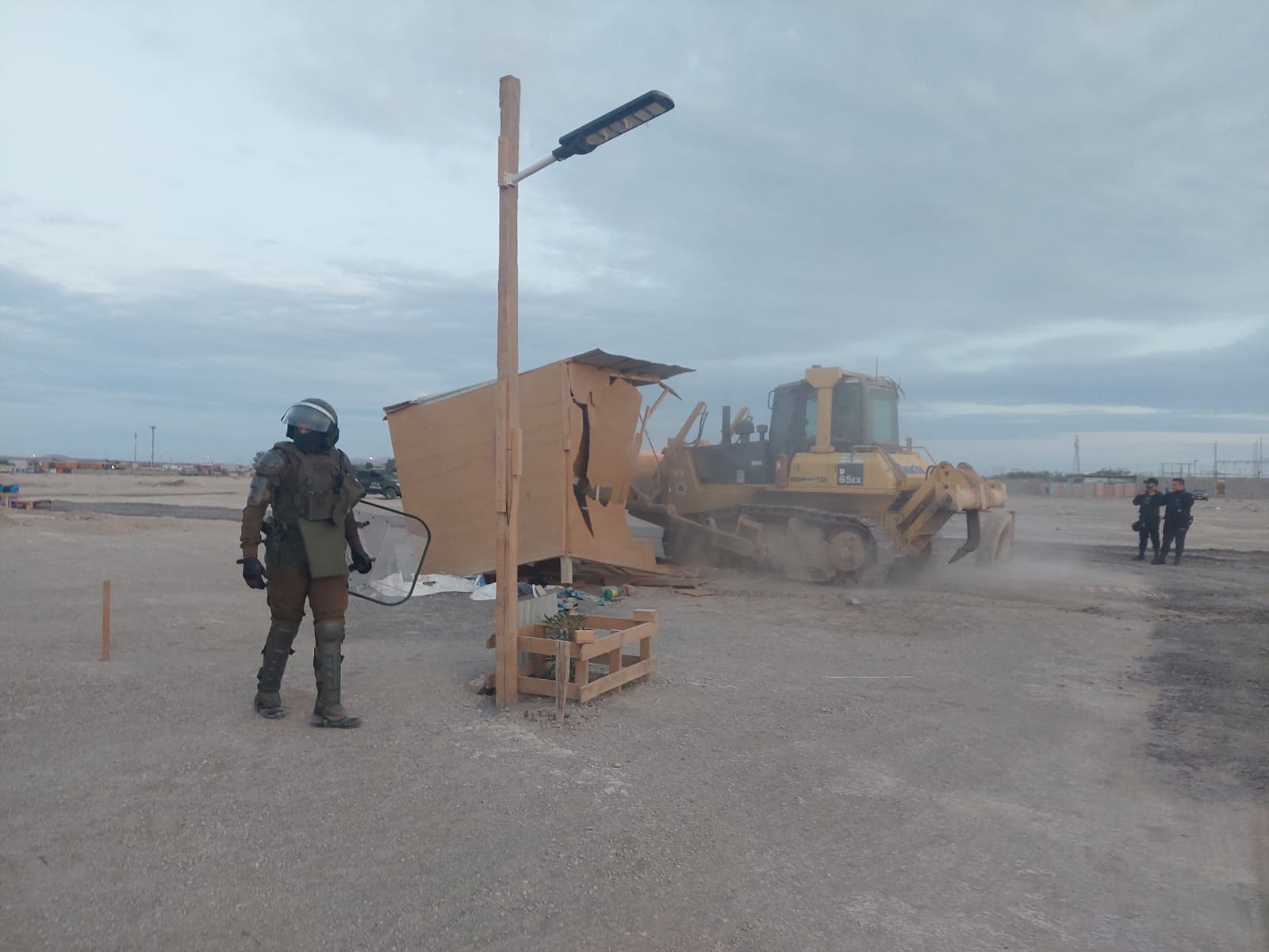 Funcionarios de la Delegación Presidencial del Tamarugal, la Seremi de Bienes Nacionales y Carabineros, en uso de sus facultades, verificaron que las mejoras estuvieran desocupadas, procediendo al desarme de 24 mediaguas con maquinaria pesada, las cuales eran usadas como bodegas para almacenar materiales de construcción.