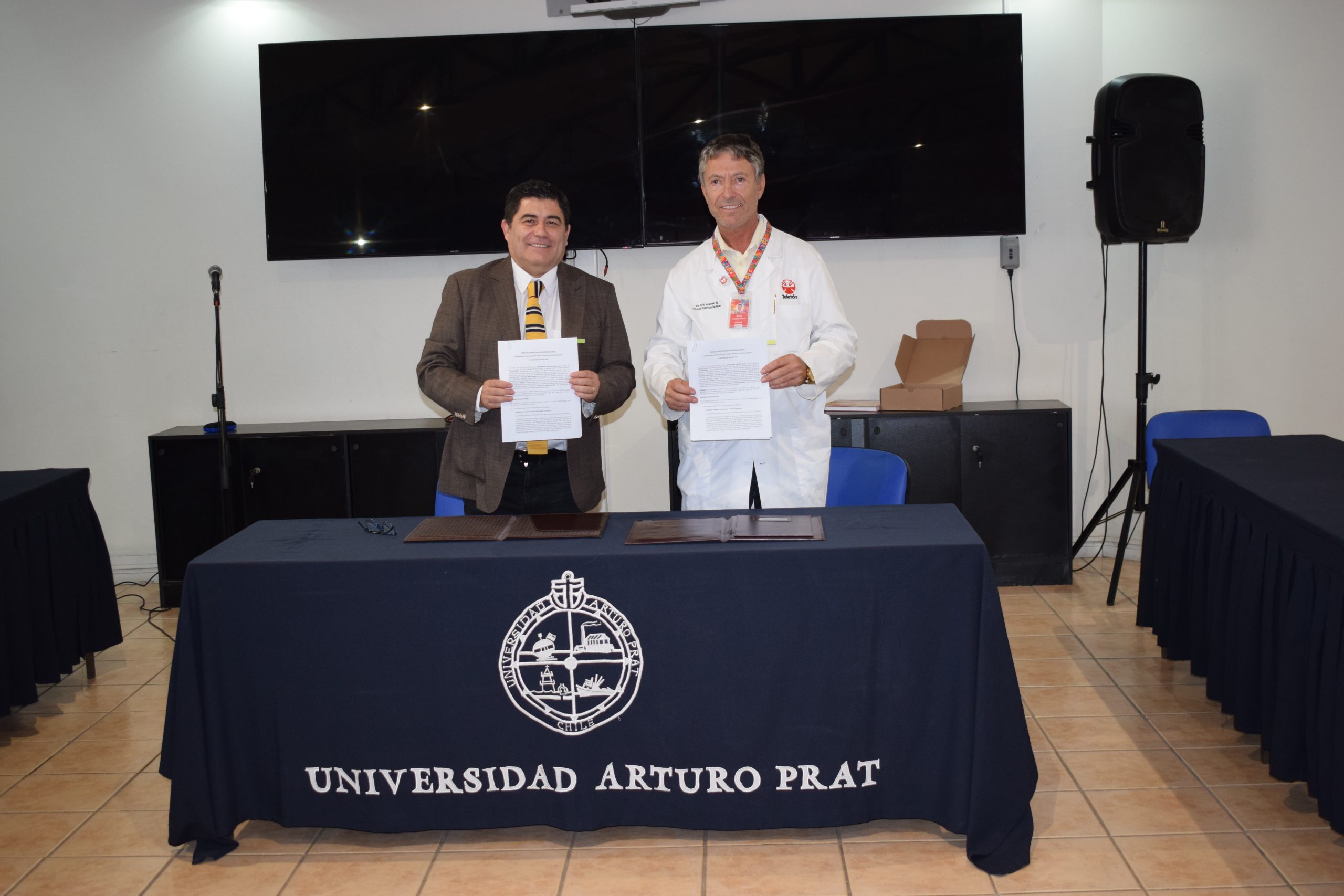 El Rector de la Universidad Arturo Prat (UNAP), Alberto Martínez, y el director del Instituto Teletón de Iquique, Julio Volenski, suscribieron un nuevo convenio de prácticas docentes para estudiantes de Kinesiología, Fonoaudiología y Psicología de la UNAP, con prestaciones de salud en el área de rehabilitación.