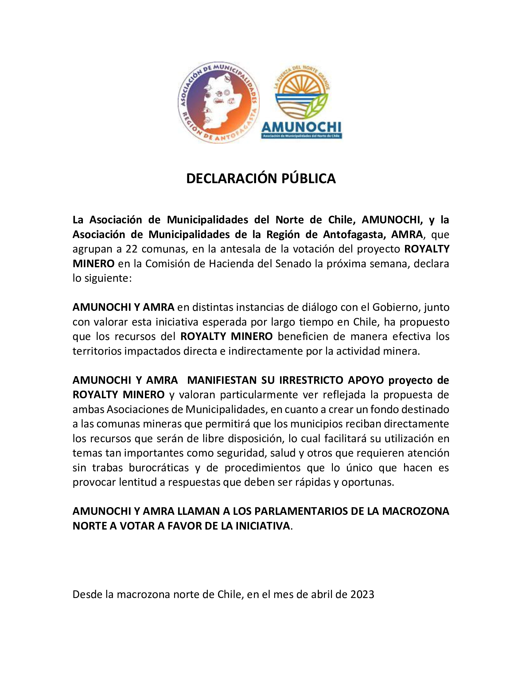 La Asociación de Municipalidades del Norte de Chile, AMUNOCHI, y la Asociación de Municipalidades de la Región de Antofagasta, AMRA, que agrupan a 22 comunas, en la antesala de la votación del proyecto ROYALTY MINERO en la Comisión de Hacienda del Senado la próxima semana, declara lo siguiente: