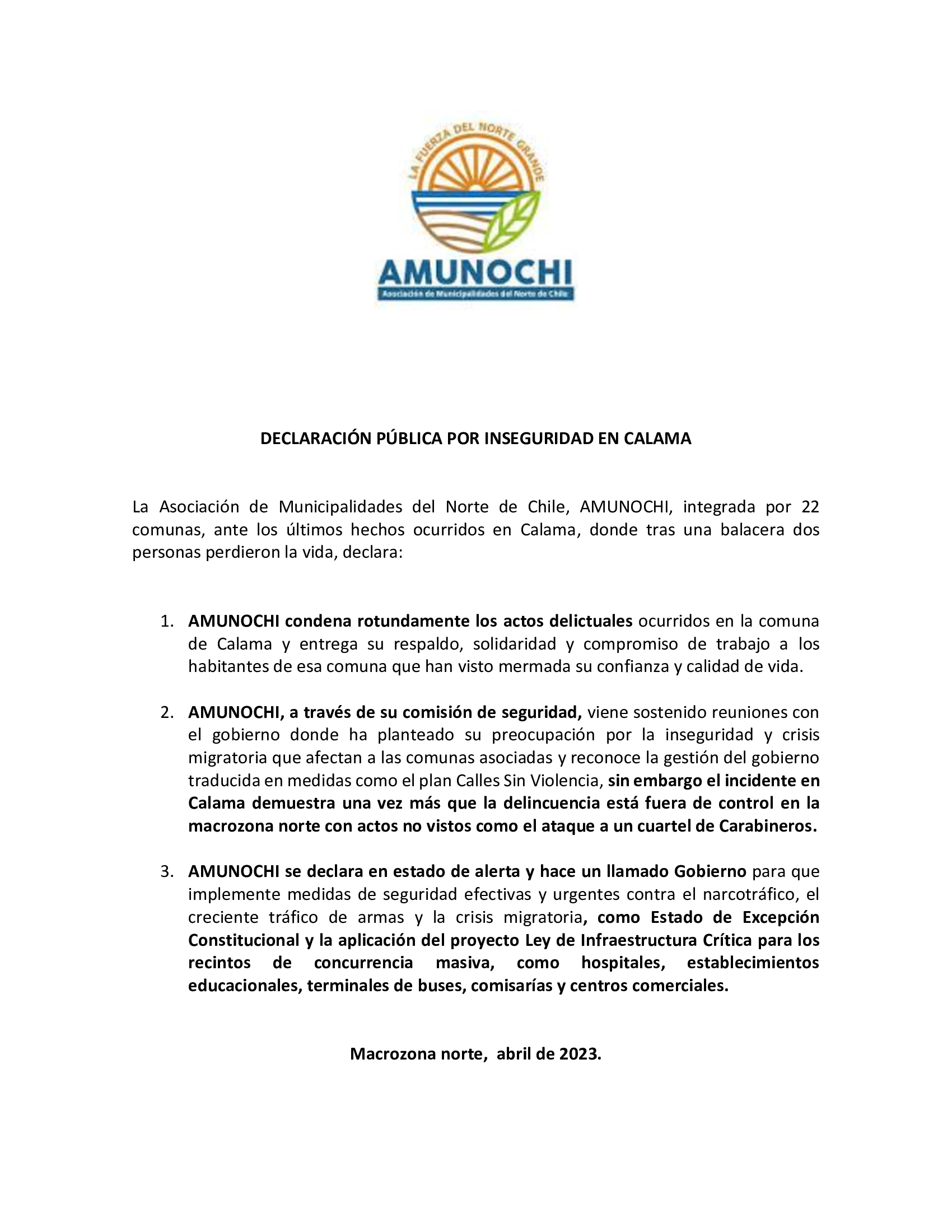 La Asociación de Municipalidades del Norte de Chile, AMUNOCHI, integrada por 22 comunas, ante los últimos hechos ocurridos en Calama, donde tras una balacera dos personas perdieron la vida, declara: