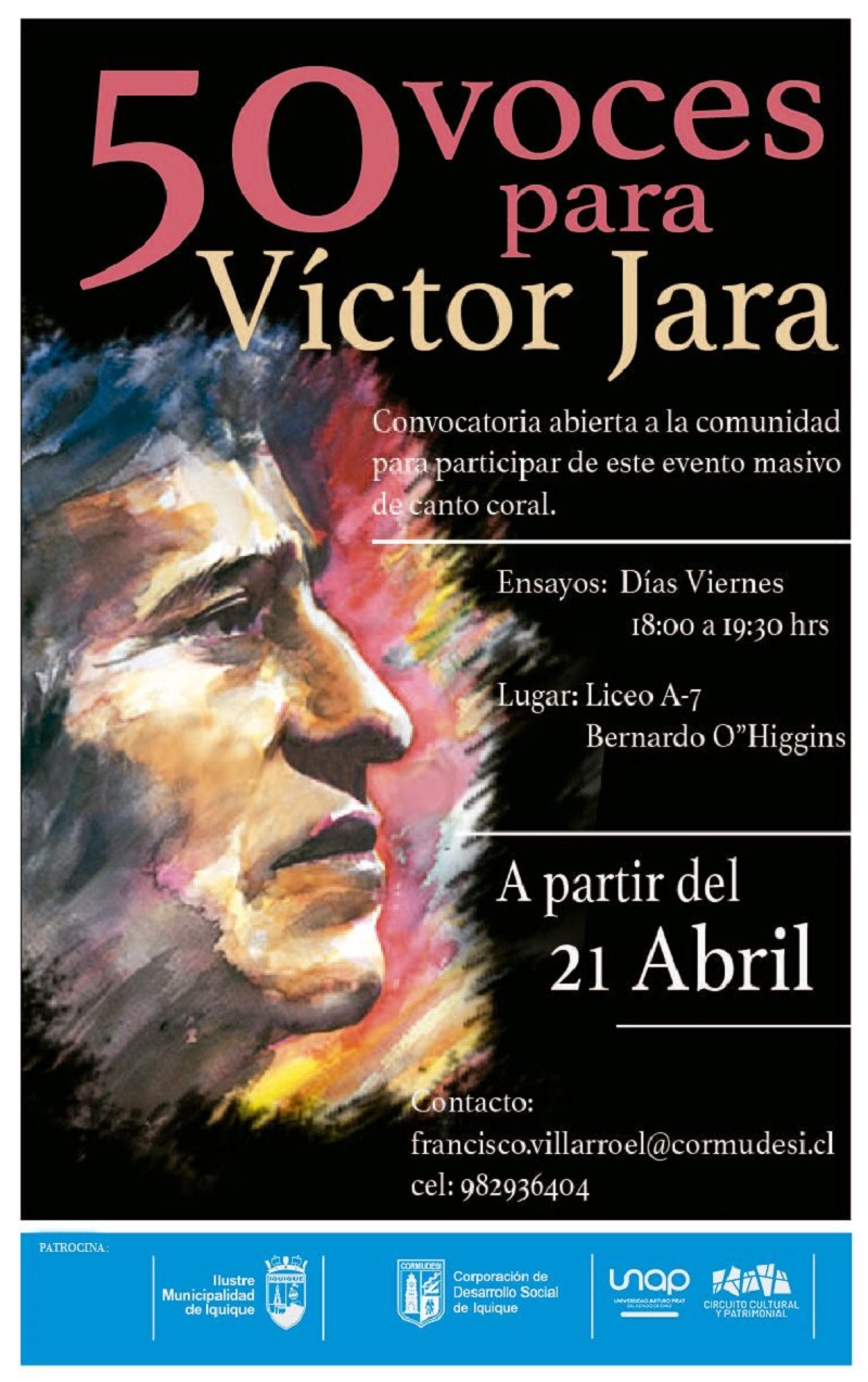 Destacar el legado creativo y cultural del reconocido cantautor nacional Víctor Jara —considerado uno de los pilares de la música latinoamericana y un referente del movimiento musical y social de la “nueva canción chilena”—, es el objetivo del proyecto artístico colectivo que incluirá coros e instrumentos, y que es impulsado por la Municipalidad de Iquique con apoyo del Circuito Cultural y Patrimonial, de la Dirección General de Vinculación con el Medio, de Universidad Arturo Prat (UNAP).