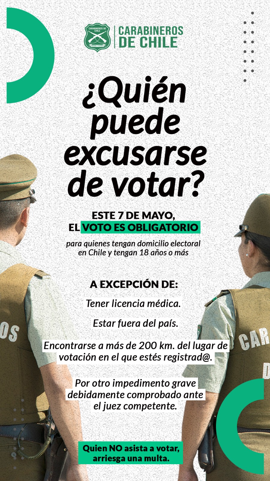 “Debemos recordar que en estas elecciones de Consejo Constitucional 2023 el voto es obligatorio para los mayores de 18 años que tengan domicilio electoral en Chile, por lo que quienes no puedan concurrir a cumplir con su deber cívico por encontrarse lejos de su lugar de votación deberán concurrir durante este domingo hasta las unidades policiales para dejar constancia de este hecho”.