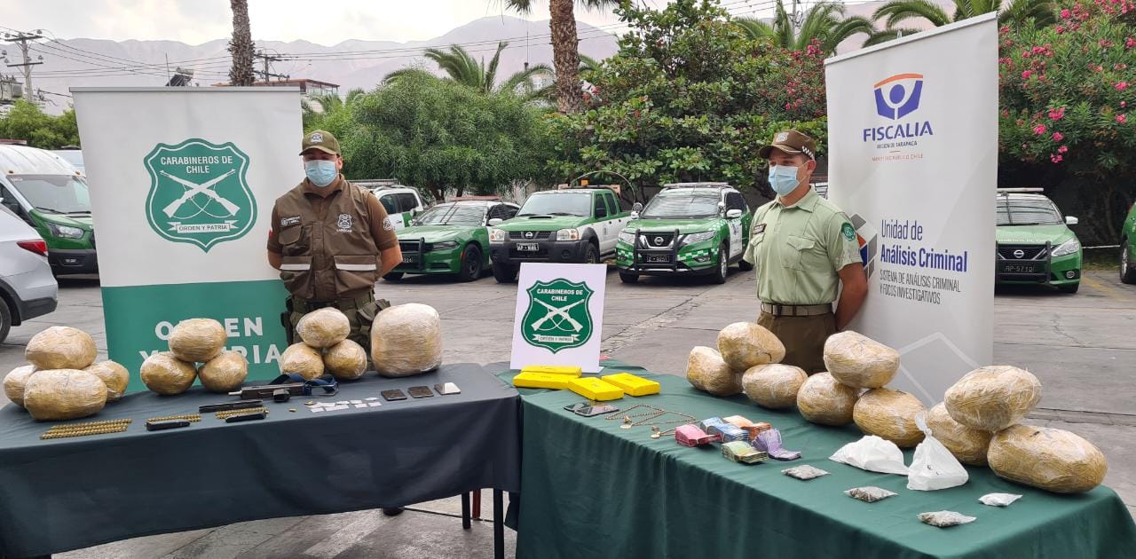 Diligencias investigativas desarrolladas por Carabineros del OS 7 Iquique en coordinación con la Fiscalía de Análisis Criminal y Foco Investigativo permitieron detener a una organización criminal dedicada al tráfico de drogas y recuperar una subametralladora mini UZI que mantenían en su poder.