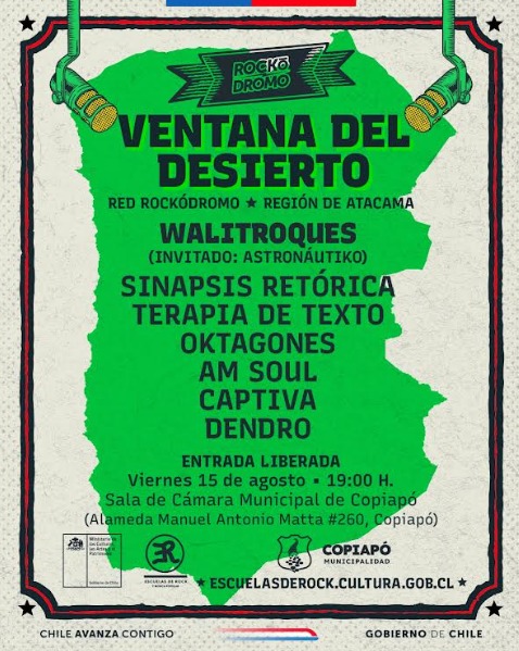 Este viernes 15 de agosto, a partir de las 19:00 horas en la Sala de Cámara Municipal de Copiapó, la música en vivo será la protagonista de “Ventana del Desierto”, festival de la Red Rockódromo que forma parte del programa Escuelas de Rock y Música Popular del Ministerio de las Culturas, las Artes y el Patrimonio.