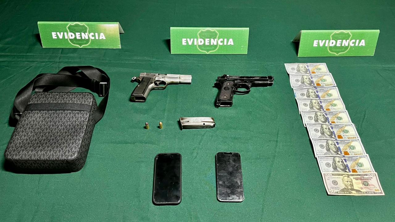 Al inspeccionar el móvil encontraron al interior dos pistolas, un cargador, municiones y 850 dólares en efectivo, por lo que se detuvo a los dos ocupantes, de 17 y 14 años, ambos de nacionalidad chilena, manteniendo el mayor de ellos antecedentes por robo frustrado.