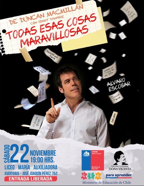 La Seremi de Educación Carolina Vargas Bruna invitó a las familias y comunidades educativas de la región de Tarapacá a presenciar la obra de teatro «Todas esas cosas maravillosas» que el actor Álvaro Escobar pondrá en escena este sábado 22 de noviembre a las 19 horas en el auditorio del Liceo María Auxiliadora de Iquique, ubicado en la intersección de las calles José Joaquín Pérez con Barros Arana, comuna de Iquique.