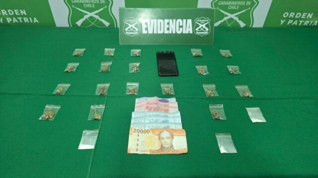 Debido a ello se le efectuó una fiscalización, encontrando entre sus pertenencias 19 bolsas de marihuana, tres bolsas de clorhidrato de cocaína y 62 mil pesos en dinero en efectivo, por lo que se procedió a la detención del individuo por tráfico en pequeñas cantidades y a la incautación de las especies.