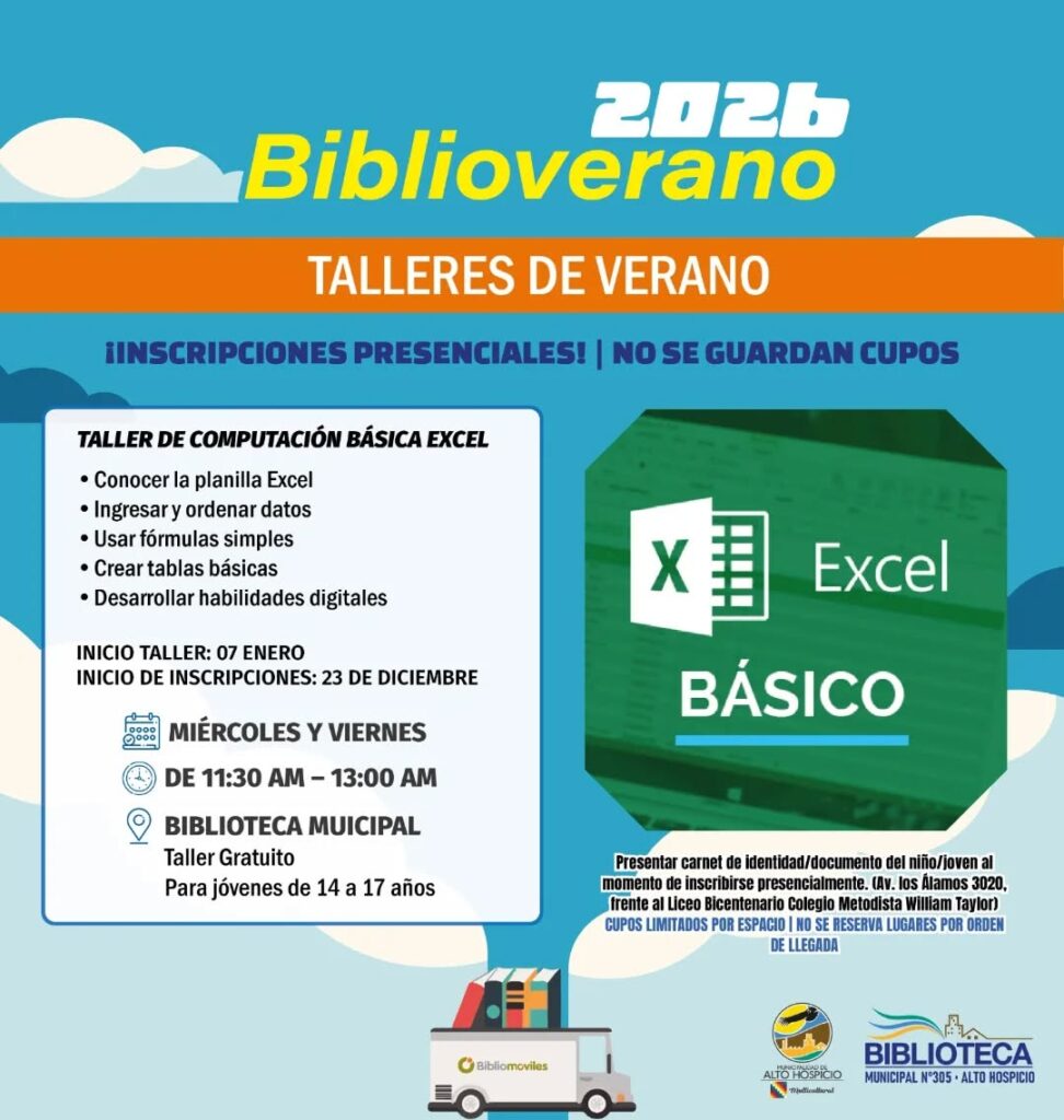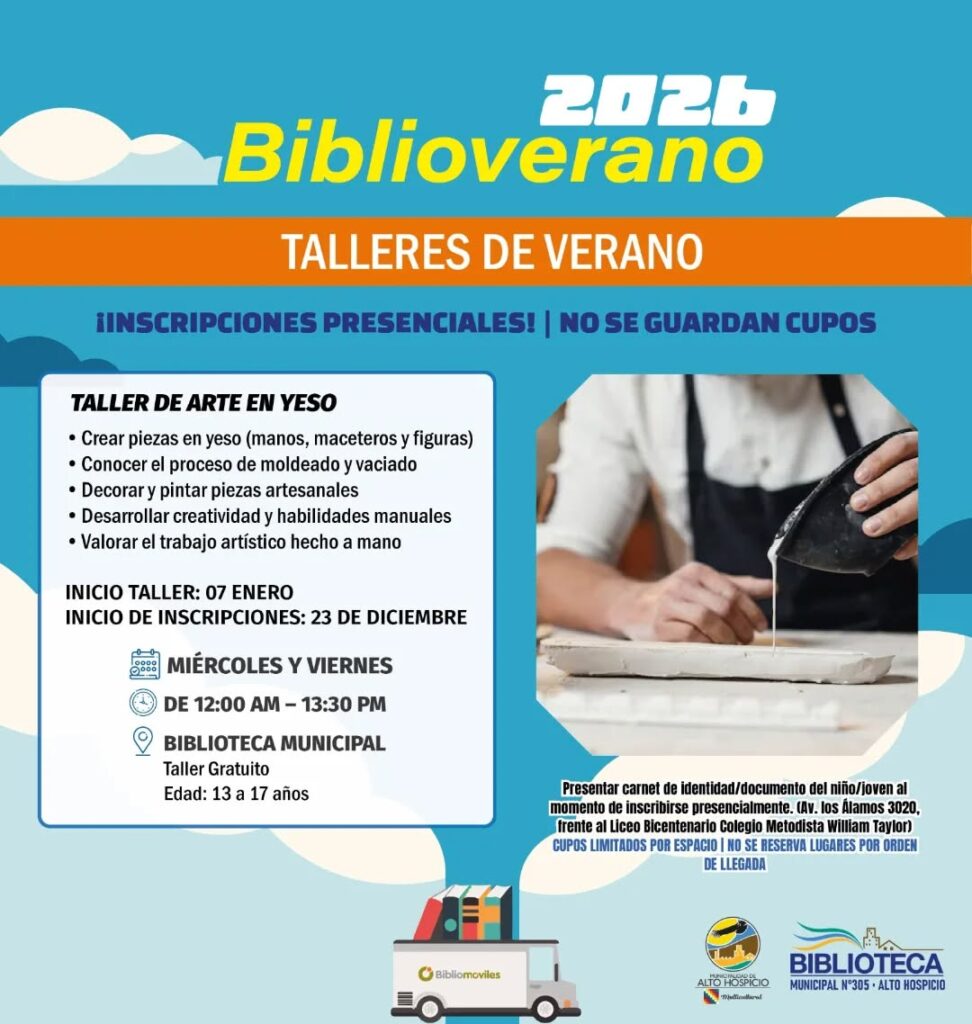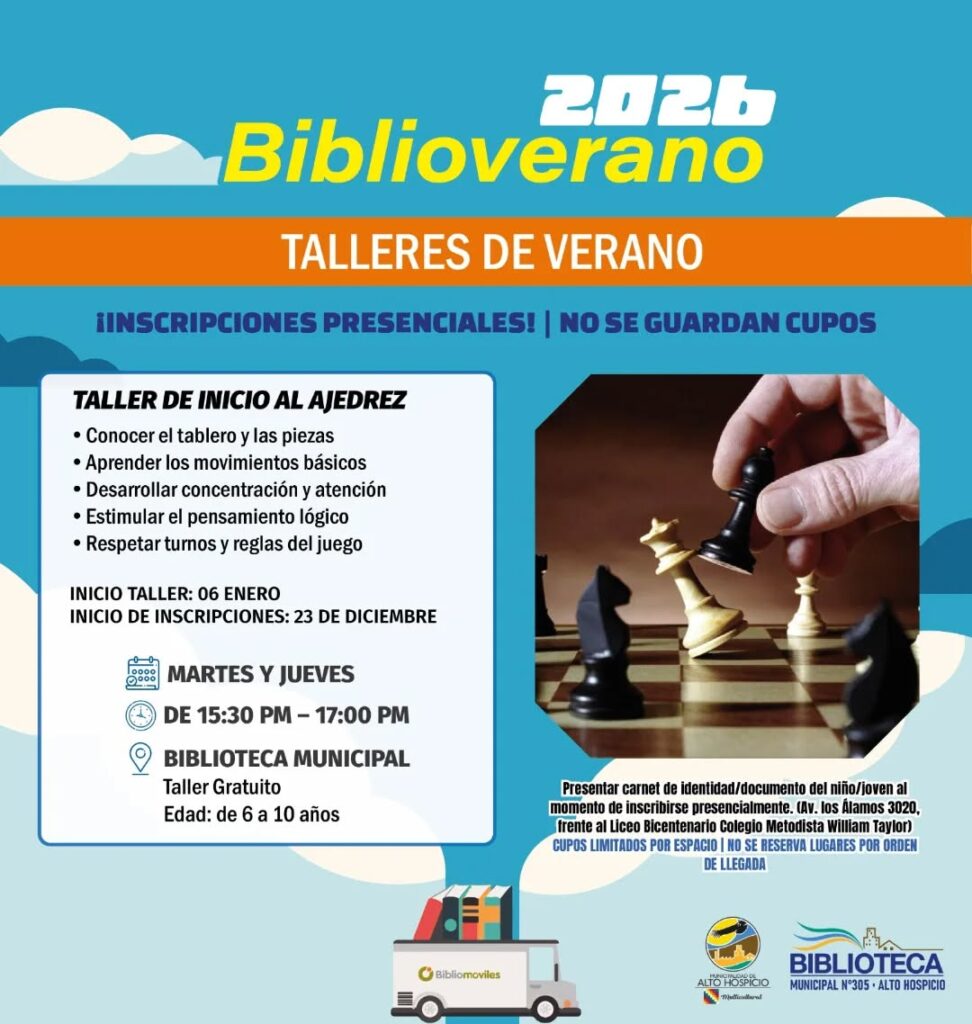 Las inscripciones se realizarán de forma presencial desde el 23 de diciembre en la Biblioteca Municipal de Alto Hospicio, ubicada en Avenida Los Álamos 3020, frente al Liceo Bicentenario Colegio Metodista William Taylor, con cupos limitados asignados por orden de llegada y presentación de cédula de identidad o documento del participante.