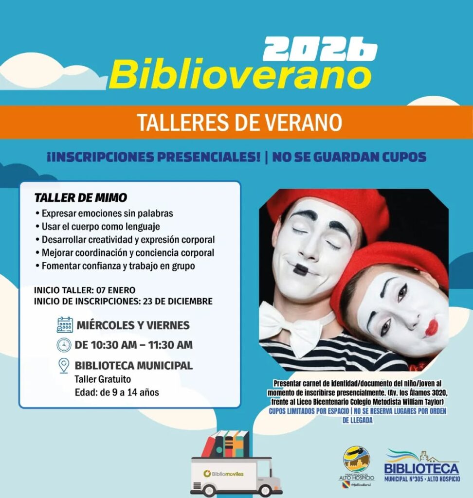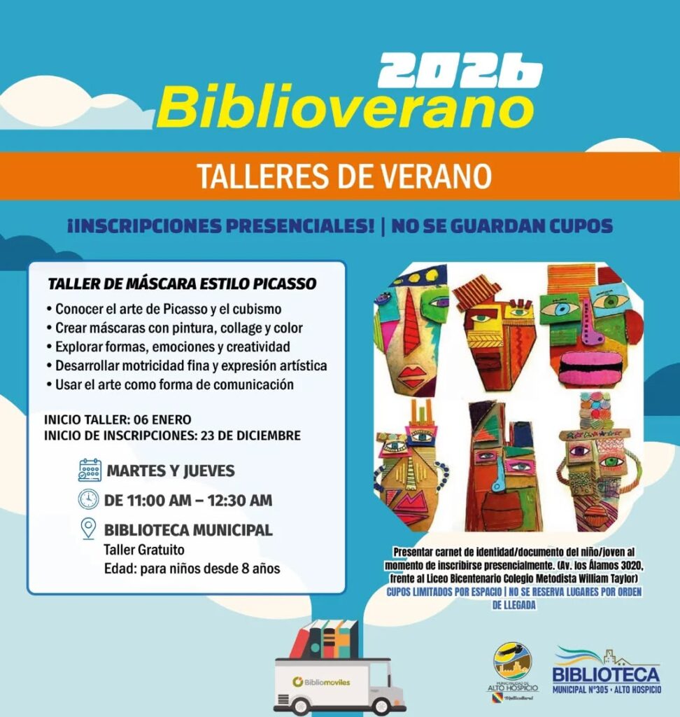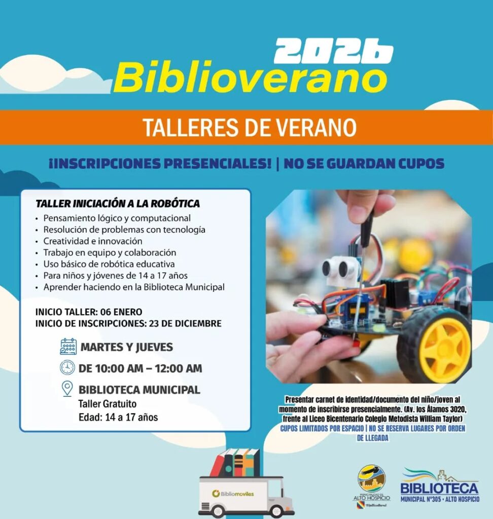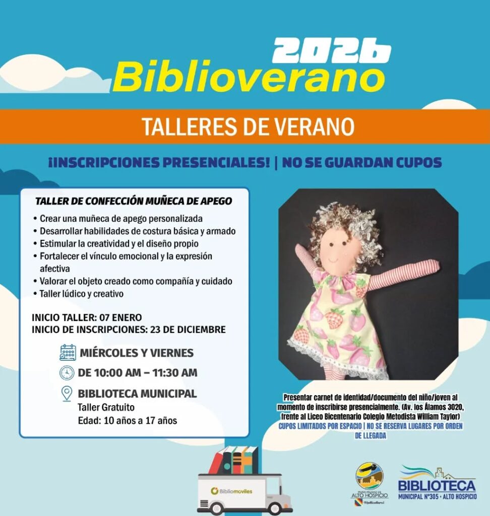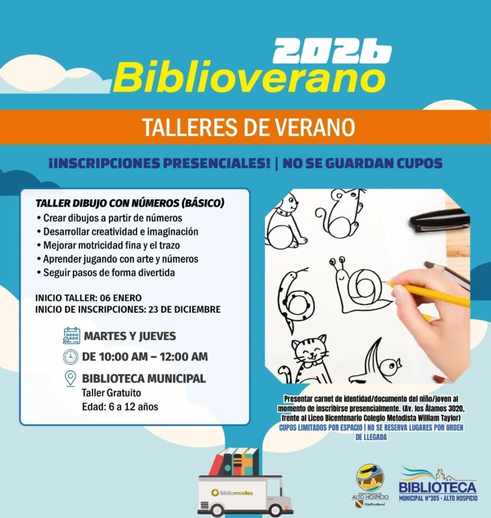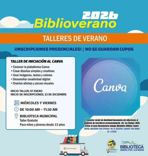 El Municipio de Alto Hospicio, a través de la Biblioteca Municipal, informa la ejecución del programa Bibliovérano 2026, que considera talleres gratuitos de verano dirigidos a niñas, niños y jóvenes de la comuna, a desarrollarse los días 6 y 7 de enero en dependencias de la biblioteca.