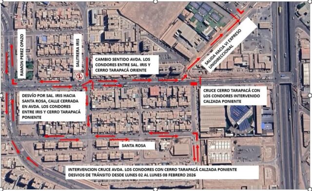 Desde este lunes 2 de febrero, se implementará desvíos de tránsito y un cambio momentáneo en el sentido de circulación en la intersección de avenida Los Cóndores con calle Cerro Tarapacá.