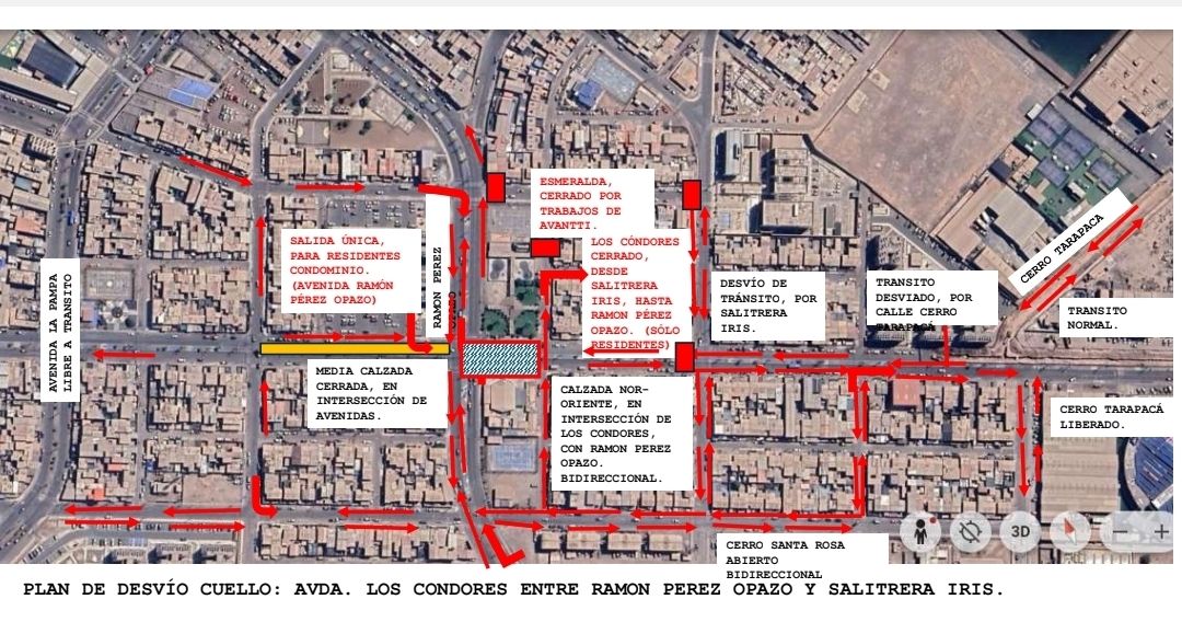 Se mantiene habilitado el tránsito por ambas calzadas de avenida Los Cóndores desde Salitrera Iris hasta la caletera, mientras que en Ramón Pérez Opazo la circulación se realizará de manera parcial durante el desarrollo de las obras.