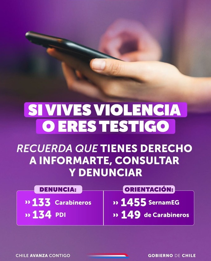 Asimismo, reiteraron que, ante una situación de riesgo o peligro inminente, es fundamental realizar la denuncia a través del 133 de Carabineros o el 134 de la Policía de Investigaciones (PDI).