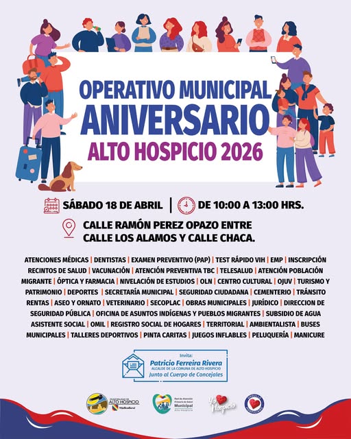 El alcalde Patricio Ferreira y el cuerpo de concejales invitan a la comunidad a asistir a un operativo gratuito con atenciones de salud y servicios municipales, este sábado 18 de abril entre las 10:00 y 13:00 horas.