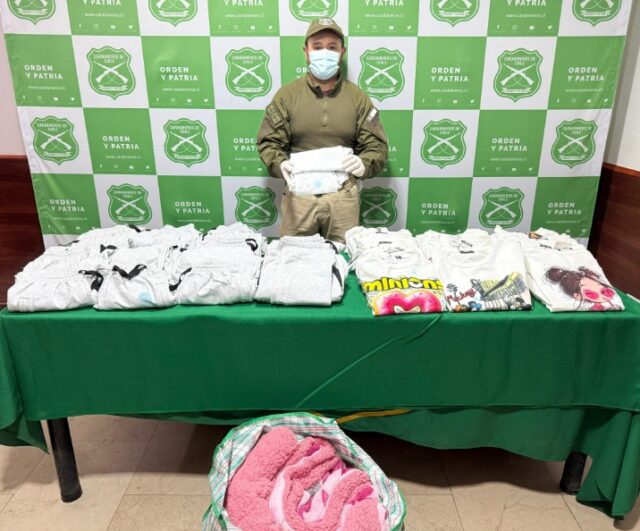 Una mujer fue detenida por Carabineros del OS7 Iquique durante un servicio preventivo realizado en la provincia del Tamarugal, tras ser sorprendida transportando más de 22 kilos de droga impregnada en diversas prendas de vestir que llevaba al interior de dos bolsos.